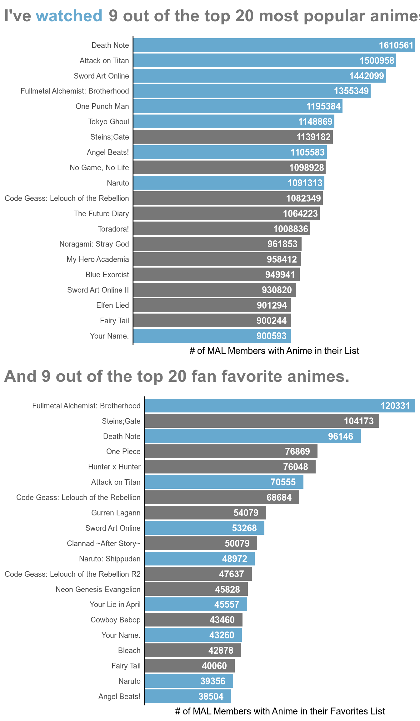 I have seen almost half of the top popular and favorite anime shows. There are definitely a few anime shows whose name I recognize from the lists above but I have yet to watch because they did not catch my interest when I would be browsing for animes to watch. However, maybe now I will give them a chance.